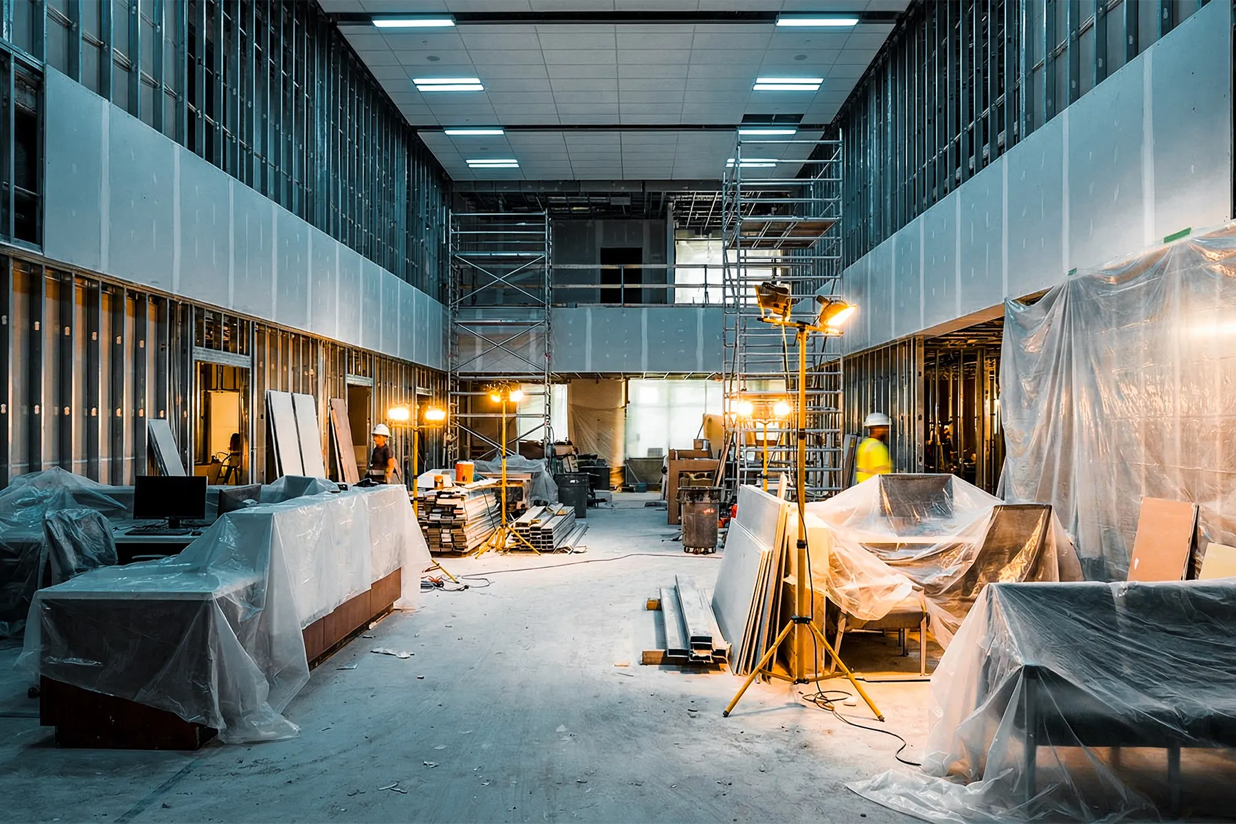 Technicians working on hospital fire safety refurbishment system.